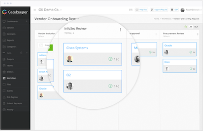 The Kanban Workflow Engine from Gatekeeper minimises some of the manual requirements. Offering a far more visual demonstration of internal operations, it helps your business to present how it onboards vendors, reviews their performance and mitigates risks in a far more digestible way. Each card, trigger and owner is easy to see.